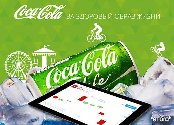 По заказу компании Etoro ( социальный трейдинг) необходимо было отобразить бренд колы причастным к спорту, движению, динамике при этом отразить акции компании на планшете и вместить текст о бренде. Я выбрала интересный способ размещения элементов, образность, четкость и креатив.