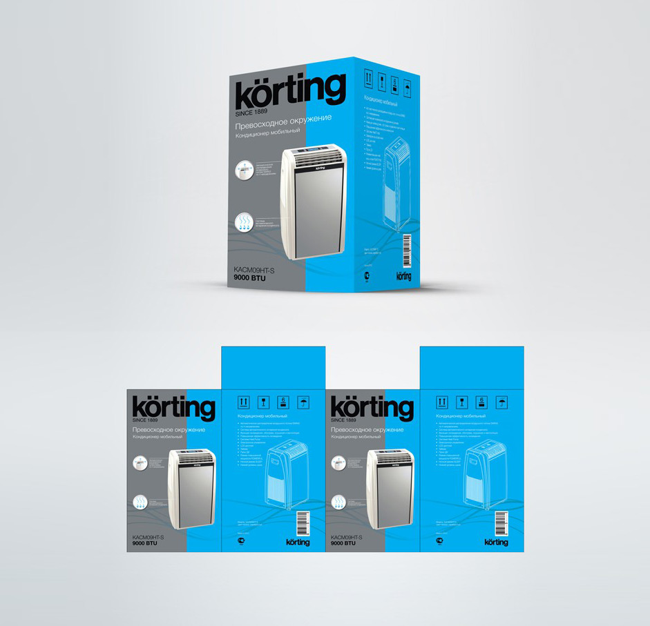 Разработка дизайна серии упаковок для мобильных кондиционеров компании KORTING. Также были разработаны серии упаковок с данным дизайном для тепловентиляторов и микроволновых печей.